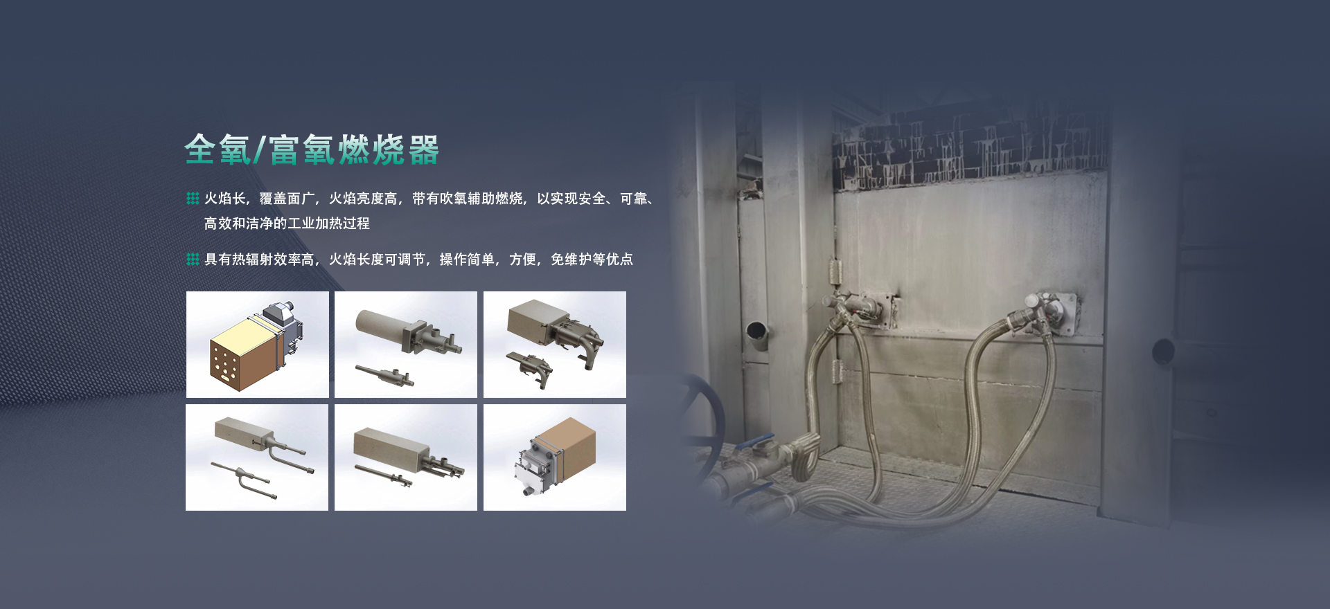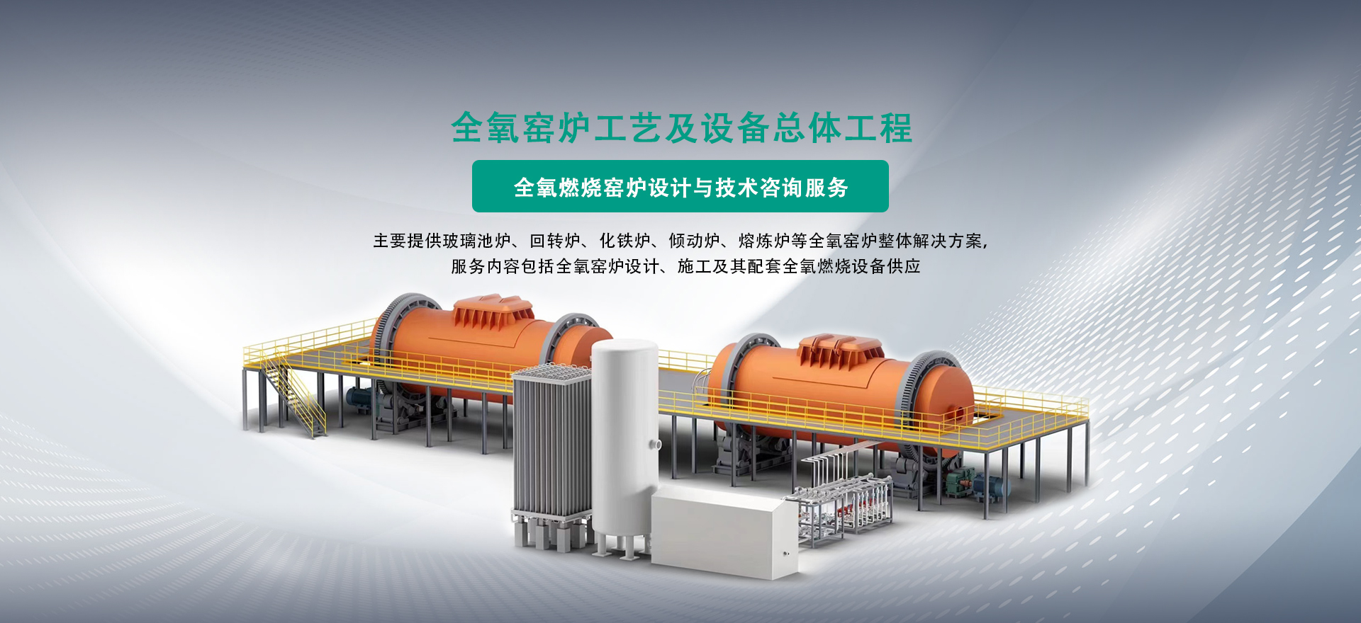 提供方案:成套熱能解決方案。高溫領(lǐng)域,采用全氧或富氧燃燒系統(tǒng),包含全氧燃燒器、燃?xì)?氧氣管路系統(tǒng)以及自動(dòng)化控制系統(tǒng)